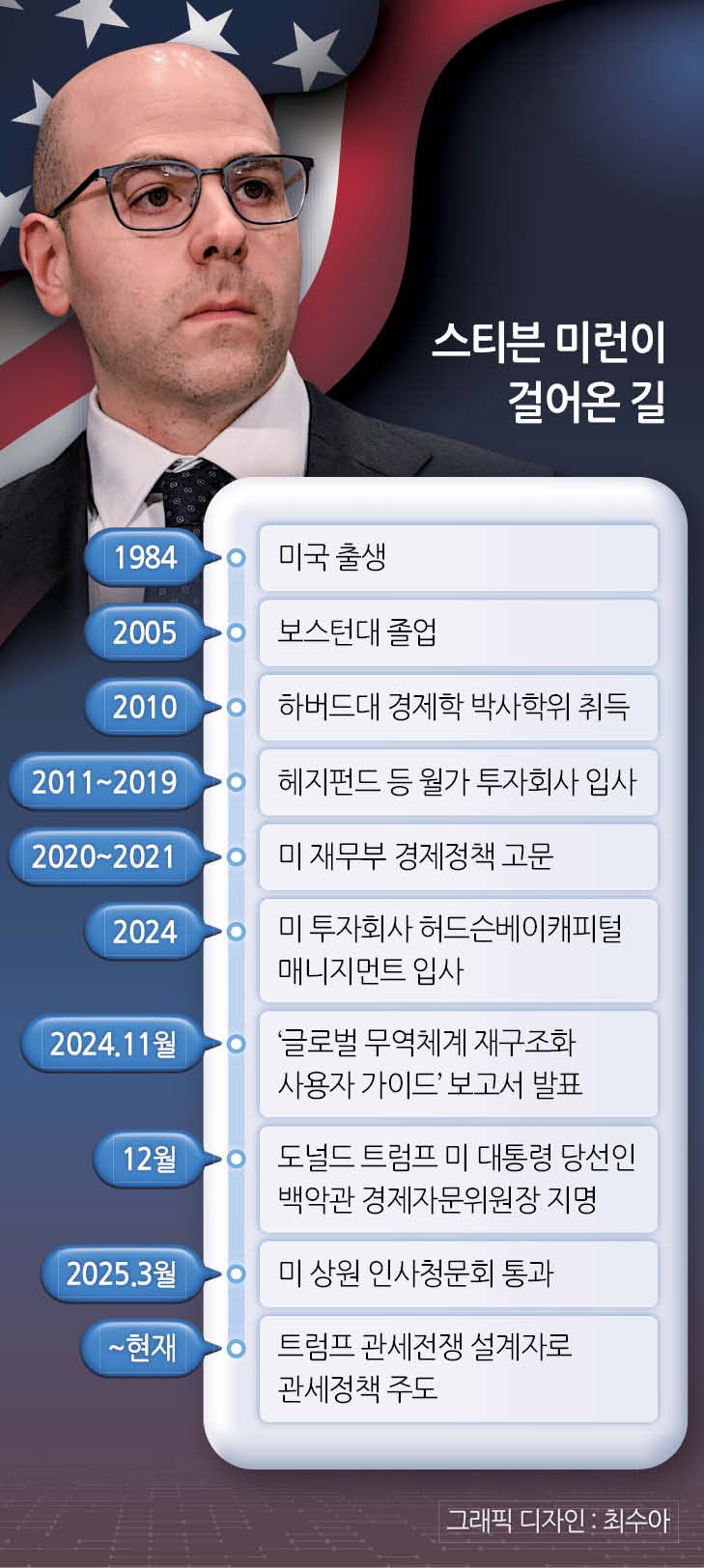공교롭게도 이런 세계관은 지난해 11월 트럼프 대통령 당선 직후 발표된 ‘글로벌 무역체계 재구조화 사용자 가이드’라는 41쪽짜리 보고서의 근간을 이루고 있다. 이 보고서를 작성한 미국 투자회사 허드슨베이캐피털매니지먼트의 매크로 전략 담당자 스티븐 미런(41)은 한 달 후 트럼프 행정부의 경제정책 자문을 총괄하는 백악관 경제자문위원회(CEA) 위원장으로 지명된다. 이 보고서는 결국 먹혀들었고, 미런 위원장은 불과 41세의 나이에 세계 초강대국의 경제정책을 좌우하는 핵심 공직자로 거듭난 것이다. 트럼프 1기 미 재무부 경제정책 고문에서 트럼프 2기 CEA 위원장으로 ‘퀀텀 점프’에 성공한 그는 소셜미디어 엑스에 “매우 영광스럽다”는 소감을 남겼다. 그러면서 “미국 경제를 인플레이션 없이 빠르게 성장시켜 미국인에게 번영을 안겨줄 대통령의 정책을 위해 일하길 기대한다”고 썼다.