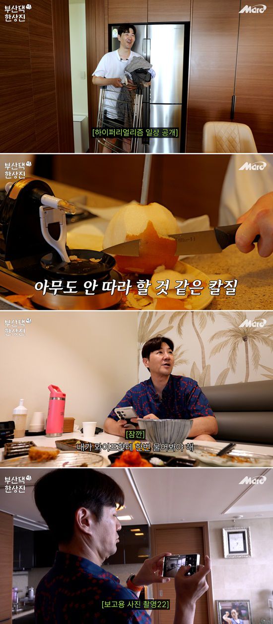 아무런 준비 없이 촬영팀을 맞이한 그는 "요즘 예능 이렇게 찍어요?"라며 당황한 모습을 보이는가 하면, 손님 접대용 과일을 자동 깎이 기계로 깎으려다 기계 고장으로 마치 스테이크를 써는 듯한 모양새로 과일을 직접 깎는 장면을 펼친다.