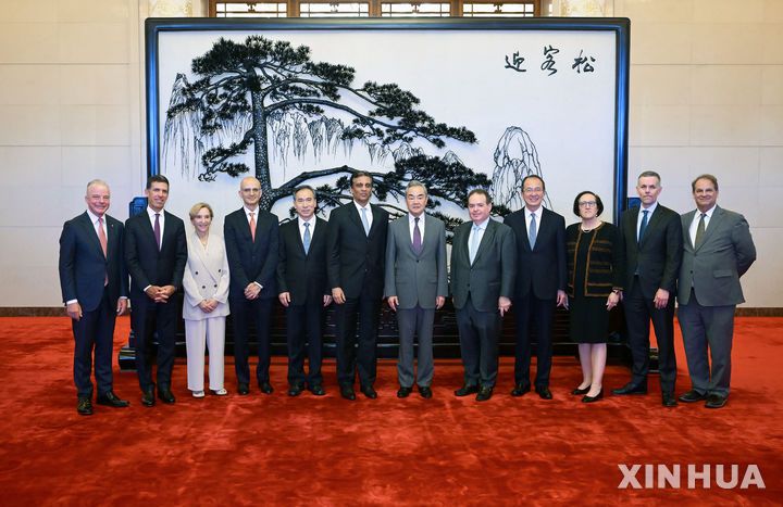 [베이징=신화/뉴시스] 왕이 중국 공산당 정치국 위원 겸 외교부장(오른쪽에서 6번째)이 30일 베이징에서 미중무역전국위원회(USCBC) 대표단과 만나 기념 촬영을 하고 있다. 왕 부장은 대표단과의 회담에서 미중 양국이 교류와 협력을 강화해야 한다는 입장을 재확인했다. 2025.07.31 |