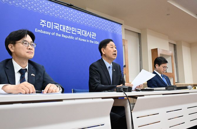 구윤철 경제부총리 겸 기획재정부 장관이 30일(현지시간) 미국 워싱턴DC 주미한국대사관에서 열린 ‘한-미 통상협의 결과브리핑’에서 발표문을 낭독하고 있다. 왼쪽부터 김정관 산업통상자원부 장관, 구윤철 부총리, 여한구 통상교섭본부장. (사진=기획재정부) |