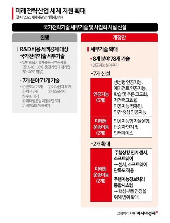 현재 조세특례제한법상 국가전략기술로 지정된 산업은 반도체, 2차전지, 백신, 디스플레이, 수소, 미래형 이동 수단, 바이오의약품과 AI다. 국가전략기술로 인정되면 관련 분야 연구개발(R&D) 관련 투자 비용에 높은 세액공제율을 적용받는다. 중소기업은 40~50%, 중견기업과 대기업은 30~40%의 세액공제를 적용받는다.