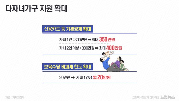정부가 다자녀 가구에 대한 세부담을 완화하기 위해 신용카드 등 사용액에 대한 소득공제 기본한도를 자녀 수에 따라 상향 조정한다. 총 급여 7천만 원 이하 근로자는 자녀당 50만 원씩(최대 100만 원), 7천만 원 초과자는 자녀당 25만 원씩(최대 50만 원)을 추가 공제 받게 된다.