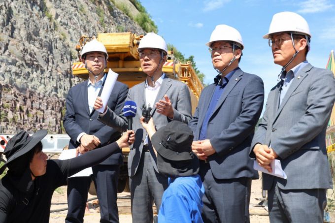더불어민주당 산재예방 TF(태스크포스) 소속 의원들이 31일 천공기 끼임으로 인한 사망사고가 발생한 경남 의령나들목 경사면 보강공사 현장을 찾아 점검하고 있다./사진=김주영 더불어민주당 의원실 제공 |