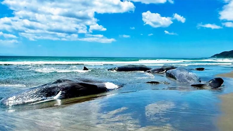 몸길이가 무려 8m나 되는 고래 4마리가 해변에 떠밀려와 있습니다.