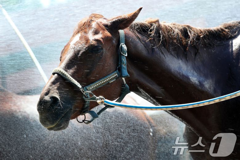 찜통더위가 계속된 31일 오후 대구 달서구 대덕승마장에서 마필관리사가 말에게 시원한 물을 뿌려 더위를 식혀주고 있다. 2025.7.31/뉴스1 ⓒ News1 공정식 기자 |