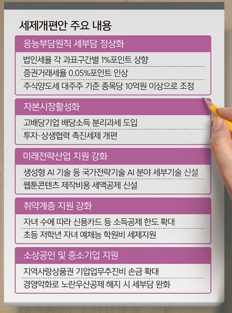 정부가 31일 발표한 세제개편안에는 배당을 촉진해 자본시장 활성화를 유도하고, 서민·중산층·다자녀가구에 혜택을 주는 민생안정 대책도 다수 반영됐다. 국가전략기술에 포함한 인공지능(AI) 분야의 세부 기술이 구체화됐고, 웹툰콘텐츠 제작에 대한 세제지원 방안도 마련됐다.