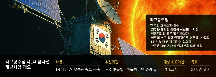 우주청은 기획연구를 보완해 오는 9월 사업 예비타당성조사에 도전하겠다는 입장이다. 예타를 무사히 통과한다고 해도 실제 사업 착수는 내후년에야 가능할 것으로 보인다. 우주청은 2035년 L4 관측탐사선을 보내겠다는 목표를 갖고 있다. L4는 지구와 약 150만㎞ 떨어져 있다.