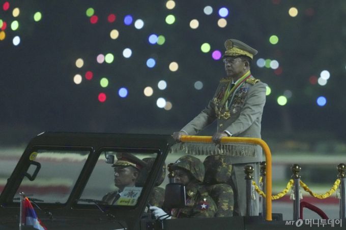 [네피도=AP/뉴시스] 민 아웅 흘라잉 미얀마 최고사령관이 27일(현지 시간) 미얀마 네피도에서 미얀마 제80주년 국군의 날을 맞아 군·경을 사열하고 있다. 흘라잉 사령관은 이날 "오는 12월 다당제 민주주의 선거 시행 준비를 하고 있으며 승리 정당에 권력을 이양할 것"이라고 말했다. 2025.03.28. /사진=민경찬