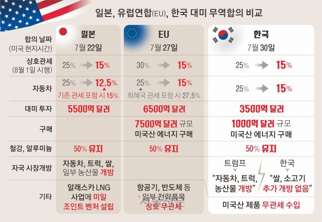 이번 투자 약속 규모는 한국보다 앞서 미국과 협상을 타결한 일본(5500억 달러·764조원), 유럽연합(EU·6000억 달러·833조 3000억원)보다 작다. 그러나 국내총생산(GDP) 대비 비중을 고려하면 한국의 부담이 상대적으로 크다는 지적도 있다.