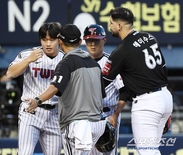 31일 서울 잠실구장에서 열린 KT-LG전. 3회말 1사 1, 3루 손용준이 헤드샷에 맞았다. 직구 헤드샷을 던진 헤이수스가 퇴장 당하며 손용준에게 사과하고 있다. 잠실=정재근 기자 cjg@sportschosun.com/2025.7.31/