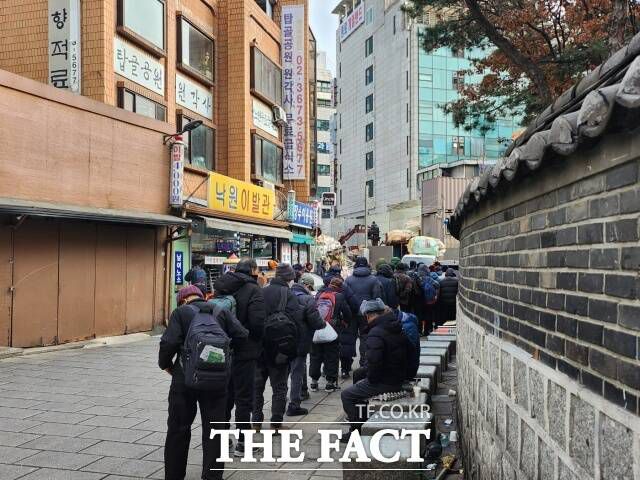 보건복지부는 31일 제77차 중앙생활보장위원회를 열고 2026년도 기준 중위소득을 6.51%로 올렸다. 이로 인해 1인 가구는 올해 76만원인 생계급여를 내년 82만원 받는다. 정부는 역대 최대 인상률이라고 하지만 여전히 가난한 국민의 삶을 보장하지 못한다는 반발도 있다.사진은 2023년 12월 19일 서울 종로구 탑골공원 인근 원각사 무료급식소 앞에서 점심을 먹기 위해 사람들이 줄을 서있는 모습 /사진=이윤경 기자 |