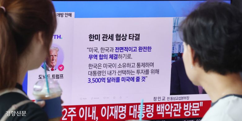 협상 잘됐나 한국과 미국 간 관세협상이 타결된 31일 서울역 대합실에서 시민들이 관련 뉴스를 시청하고 있다. 정지윤 선임기자 color@kyunghyang.com |