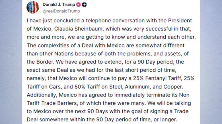 셰인바움 멕시코 대통령도 SNS에 글을 통해 트럼프 대통령과 매우 좋은 통화를 했으며 8월 1일 발표 예정이었던 관세 인상을 피하고 협정을 맺기 위한 90일의 시간을 확보했다고 썼습니다.