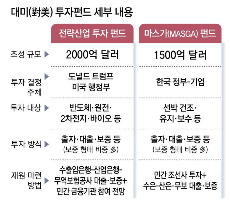 관세 타결의 ‘키’가 된 대미 투자 펀드는 반도체, 원전, 2차전지, 바이오, 핵심 광물 등에 투자하는 2000억 달러 규모 ‘전략산업 투자 펀드’와 미국의 조선업 부흥 목표에 부응하기 위한 1500억 달러 규모 ‘마스가(MASGA·Make American Shipbuilding Great Again) 펀드’로 나뉜다. 전략산업 투자 펀드는 투자 의사결정권이 전적으로 트럼프 대통령에게 있고 한국 측이 대출이나 지급보증을 제공하는 방식으로 운영될 것으로 전망된다. 반면 마스가 펀드는 한국 정부와 조선사들이 주도하는 일반 펀드라는 점에서 차이가 았다.