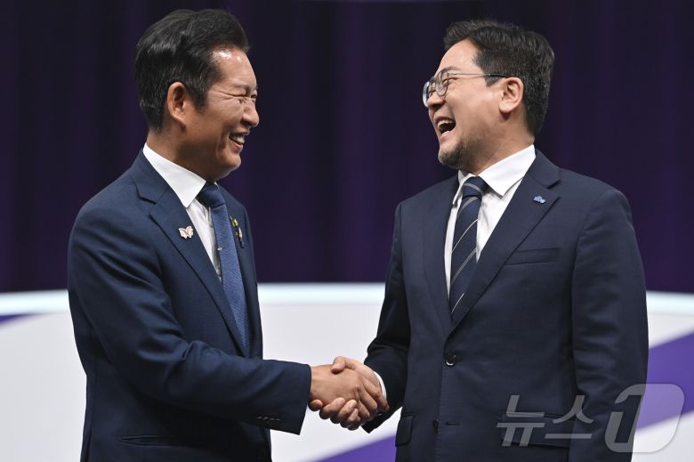 정청래(왼쪽), 박찬대 더불어민주당 당대표 후보들이 지난달 29일 오후 서울 마포구 MBC에서 열린 TV토론회에 참석해 기념 촬영하고 있다. (공동취재) 2025.7.29/뉴스1 ⓒ News1 신웅수 기자