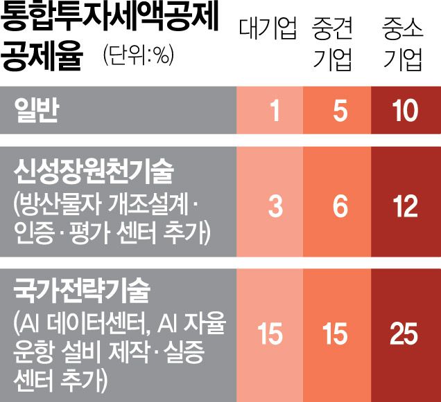 현재 정부는 7개 분야, 58개 국가전략기술 사업화시설을 지정해 투자 금액에 대해 기업 규모별로 15~25% 세액공제 혜택을 주고 있다. 이 중 반도체에는 한시적으로 5%포인트를 더 얹어 20~30%의 세액공제 혜택을 준다. 정부는 AI 분야를 국가전략기술로 추가해 세액공제 대상을 늘리기로 했다. AI 혁신 생태계 조성에 필수적인 △생성형 AI 기술 △에이전트 AI 기술 △학습 및 추론 고도화 기술 △저전력·고효율 AI컴퓨팅 기술 △인간 중심 AI 기술 등을 세부 카테고리로 신설하고 이들 서비스를 제공하기 위한 AI 데이터센터를 사업화시설로 지정하기로 했다.