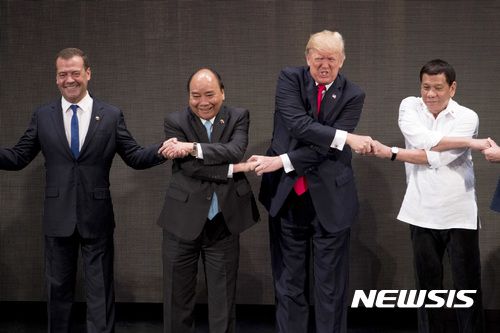 【마닐라=AP/뉴시스】도널드 트럼프 미국 대통령이 2017년 11월13일 필리핀 마닐라에서 열린 아세안(ASEAN) 정상회의 개막식에서 '아세안식 악수'를 하며 얼굴을 찡그리고 있다. 당시 러시아 총리였던 드미트리 메드베데프는 아시안식 악수를 하지 않고 벌을 벌려 옆 사람과 악수하며 웃고 있다. 두 사람이 최근 소셜 미디어에서 자주 설전을 벌인다. 2025.8.1.