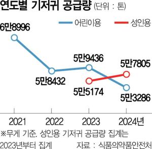 식품의약품안전처가 31일 공개한 ‘2024년 위생용품 생산실적 통계’에 따르면 지난해 성인용 기저귀 국내 공급량(생산량과 수입량의 합계)은 전년 대비 4.8% 늘어난 5만 7806톤으로 같은 기간 10.3% 급감해 5만 3286톤에 그친 어린이용 기저귀를 넘어섰다. 성인용 기저귀 공급량이 어린이용 기저귀를 넘어선 것은 통계를 집계한 이후 처음이다. 1년 전인 2023년에는 어린이용 기저귀 공급량이 5만 9436톤으로 성인용 5만 5174톤 보다 많았다.