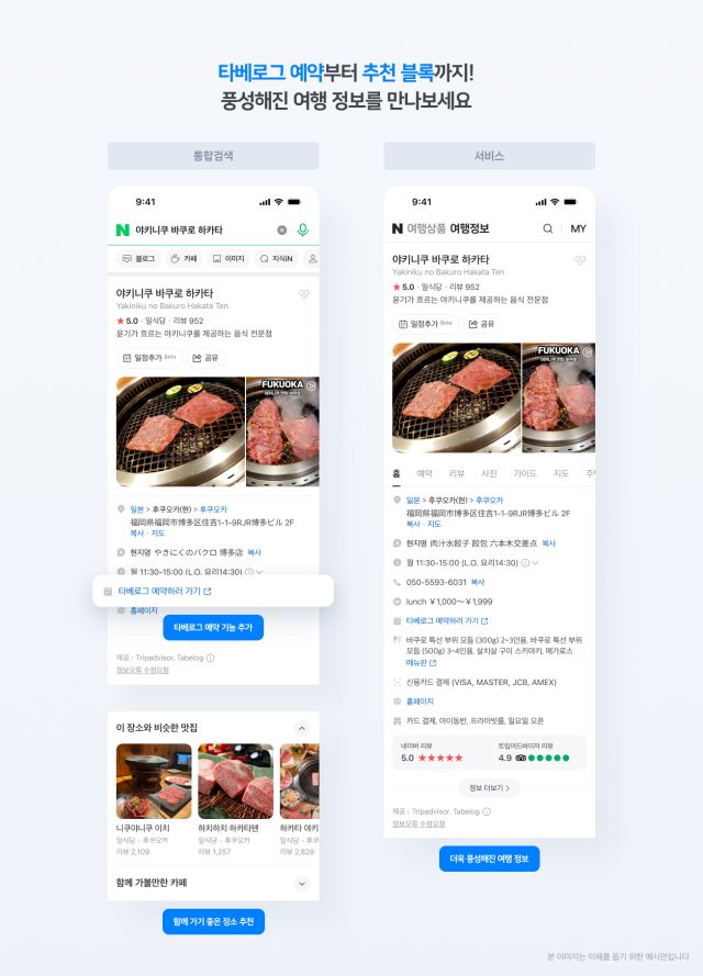 또 특정 음식점 검색 결과 하단에는 음식점 주변의 관광 정보나 유사한 성격의 맛집을 알려주는 ‘추천블록’도 제공돼 유관 여행 콘텐츠를 연이어 살펴볼 수 있다.