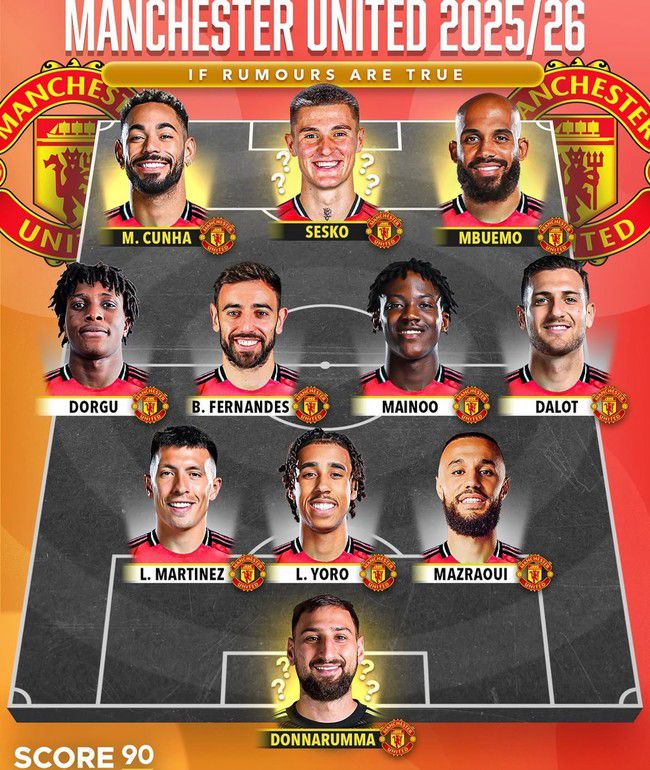 예상 라인업을 보면 확실히 강력해진다. 아모림 감독이 유지하고 있는 3-4-3 포메이션에서 골키퍼는 돈나룸마다. 3백은 리산드로 마르티네스, 레니 요로, 누사르 마즈라위가 구성할 예정이고 좌우 윙백은 패트릭 도르구, 디오고 달롯이다. 중원엔 브루노 페르난데스, 코비 마이누가 위치한다. 공격진은 쿠냐, 세스코, 음뵈모다. 루머가 나오는 선수들이 모두 영입됐을 때 예상 라인업이다.