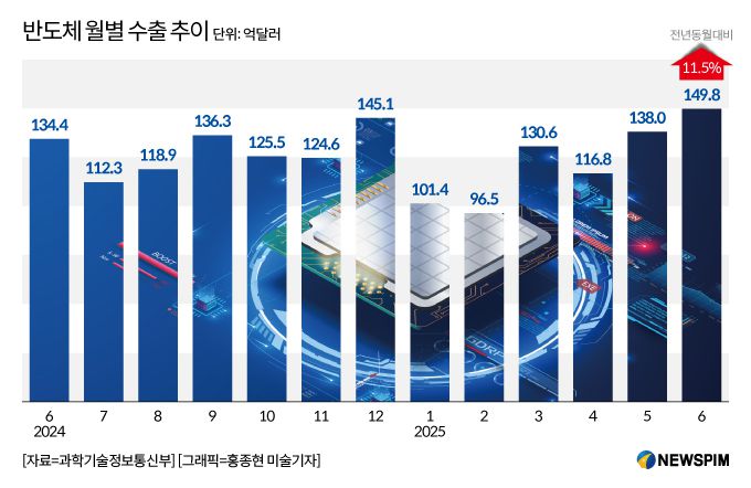 우선 반도체 수출은 메모리 반도체(94.7억달러, +39.3%)를 중심으로 고정가격 상승 흐름과 HBM·DDR5 등 고부가제품의 견조한 수요가 지속되면서 역대 7월 중 최대실적인 147.1억달러(+31.6%)를 기록했다.