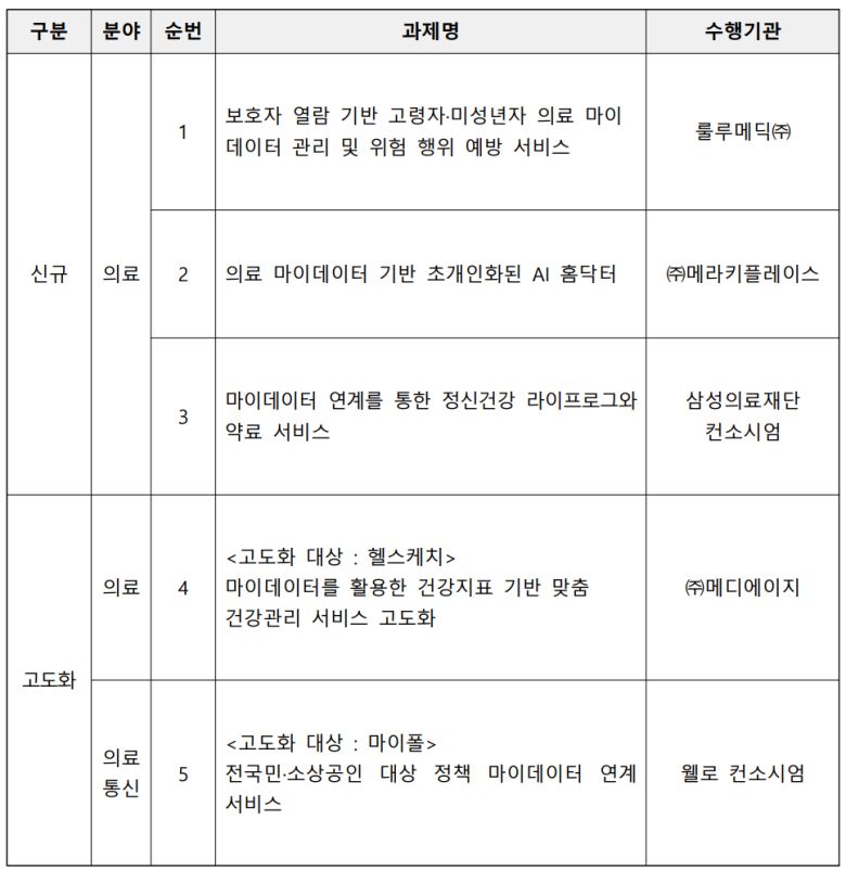 신규 서비스 개발 유형에는 보호자 열람 기반 고령자·미성년자의 의료정보 관리 및 위험징후 예방 서비스, AI기반 건강 비서 서비스, 정신건강 및 약물복용 관리 서비스가 선정됐다. 과제당 최대 5억원의 예산이 지원된다.