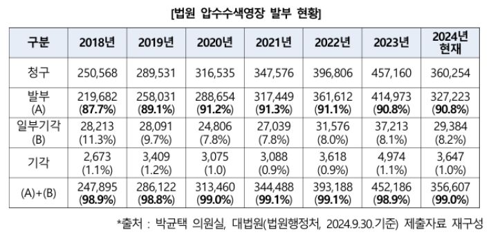 ◇ 손수호> 그런데 이런 압수수색 영장의 발부율이 거의 100%다, 99%에 이른다. 이 정도면 그냥 청구하면 다 나온다 이렇게 봐야 되는 거 아닙니까?