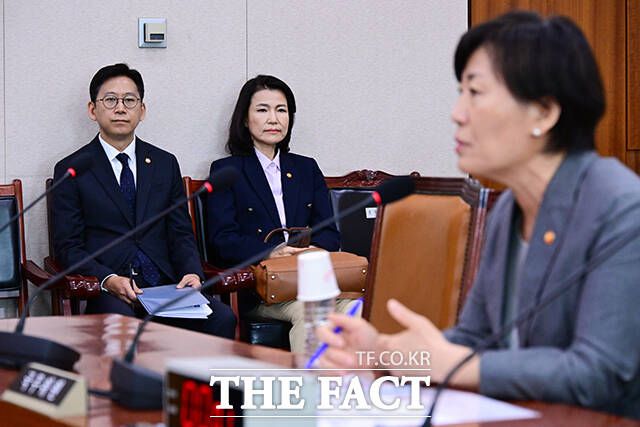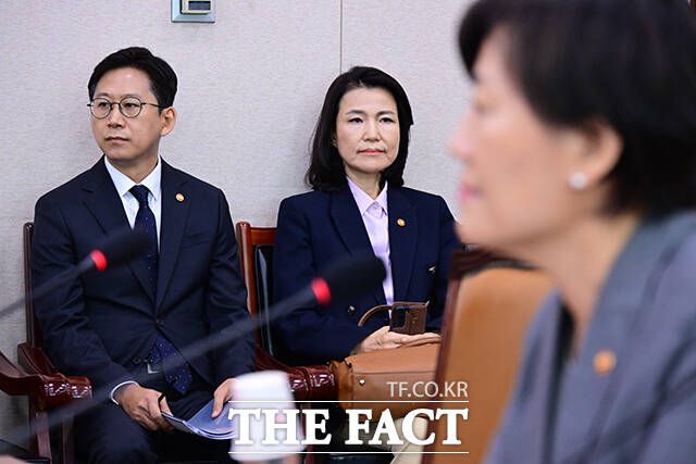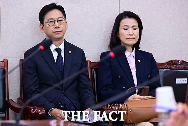 [더팩트ㅣ국회=남윤호 기자] 배경훈 과학기술정보통신부 장관과 이진숙 방송통신위원장이 1일 오전 서울 여의도 국회에서 열린 법제사법위원회 전체회의에 출석해 담당 부처 법안과 관련한 질의응답을 기다리고 있다.