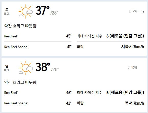 8월 2일 토요일 낮 최고기온은 37도로 예보됐으며, 체감온도는 45도까지 오를 것으로 보인다. 바람은 서북서 방향으로 시속 7km, 돌풍은 최대 22km/h에 이를 것으로 전망된다. 강수 확률은 7%로 낮고, 뇌우 가능성은 2% 수준이다. 낮 동안의 구름량은 93%로 흐린 하늘이 이어질 예정이다. 밤에는 최저기온 28도, 체감온도 33도로 역시 무더운 밤이 될 것으로 보인다.