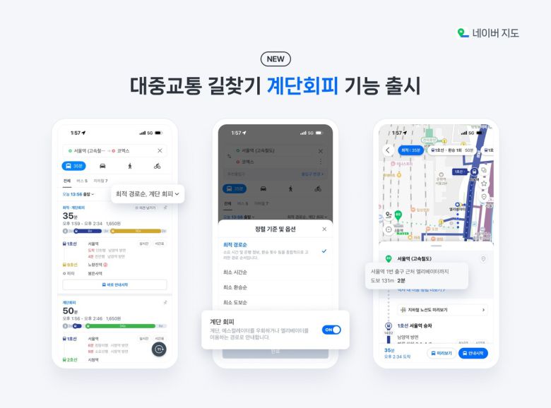 네이버는 지도 서비스 이용자가 목적지까지 편하게 이동할 수 있도록 대중교통 길 찾기에 ‘계단 회피’ 경로 안내 기능을 추가했다고 1일 밝혔다.