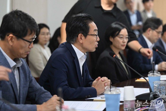 (오른쪽 다섯 번째)김완기 특허청장이 1일 오후 서울 중구 대중소기업농어업협력재단 대회의실에서 열린 중소기업 기술탈취 방지 간담회에서 모두발언을 하고 있다.