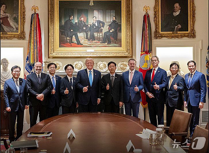 도너드 트럼프 미국 대통령이 지난 30일(현지시간) 워싱턴DC 백악관에서 구윤철 경제부총리 겸 기획재정부 장관 등 한국 정부 협상단과 무역합의를 타결한 후 기념촬영을 하고 있다. (백악관 X. 재판매 및 DB 금지) 2025.8.1/뉴스1 |