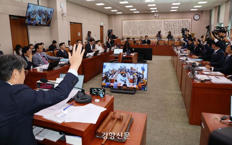 이춘석 국회 법제사법위원장이 1일 법사위 전체회의에서 야당 의원들이 반발하는 가운데 노조법 2·3조 개정안을 표결하고 있다. 박민규 선임기자 |
