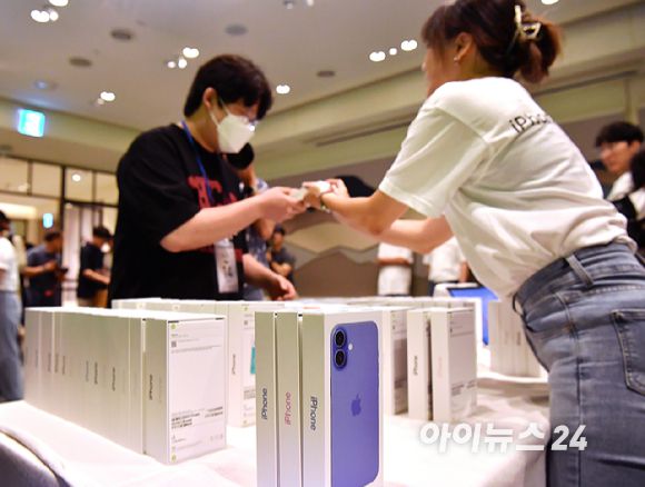 지난해 9월 서울 강남구 안다즈 호텔에서 열린 KT 아이폰 16 개통 행사에서 고객들이 제품을 받고 있다. [사진=곽영래 기자]