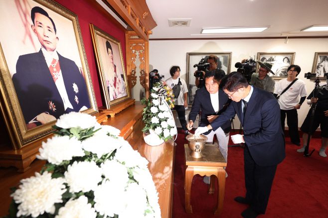국민의힘 당대표 선거에 출마한 김문수 전 고용노동부 장관이 1일 오후 경북 구미시 상모동 박정희 전 대통령 생가를 방문해 헌화하고 있다. /연합 |