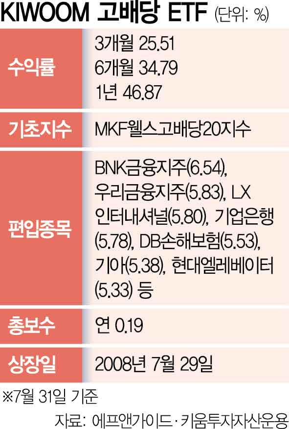 1일 금융정보 업체 에프앤가이드에 따르면 ‘KIWOOM 고배당 ETF’의 7월 31일 기준 최근 1년 수익률은 46.87%로 국내 주식형 고배당 ETF 가운데 가장 높은 성과를 기록했다. 1년 간 배당 수익률도 약 4.99%로, 최근 3년 간 주당 배당금이 한 차례도 줄지 않으며 꾸준히 배당을 했다. 지난해 말 99억 원에 불과했던 순자산(AUM)은 올해 들어 5배 이상 증가하며 현재 500억 원 규모로 확대됐다.
