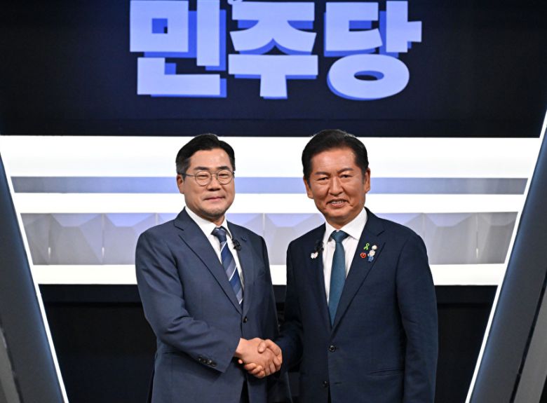 더불어민주당 박찬대, 정청래 당대표 후보가 27일 서울 여의도 KBS 신관 공개홀에서 열린 TV토론회 시작에 앞서 악수를 하며 기념촬영하고 있다. 2025.7.27 [국회사진기자단] [사진=연합뉴스] |