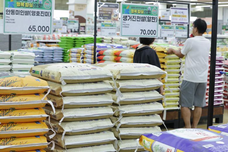 1일 서울 서초구 하나로마트 양재점을 찾은 시민들이 쌀을 고르고 있다.  대한민국은 이번 미국과의 관세 협상에서 쌀·소고기 추가 개방 없이 상호관세를 25%에서 15%로 낮췄다. 2025.8.1/뉴스1