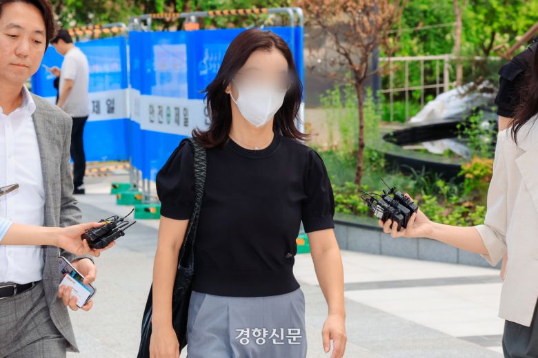 김건희 여사의 집사 김모씨 부인 정모씨가 지난달 23일 김건희 여사가 연루된 각종 의혹을 수사하는 특별검사팀(특별검사 민중기) 사무실이 있는 서울 광화문 KT빌딩으로 출석하고 있다. 이준헌 기자 |