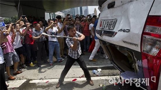 중국에서 발생한 한 반일(反日)집회에서 한 시민이 일본산 자동차를 부수고 있다.<자료사진> |
