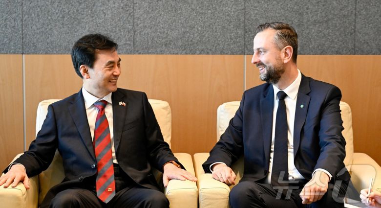(서울=뉴스1) 김진환 기자 = 안규백 국방부 장관이 1일(현지시간) 폴란드 바르샤바 글리비체에 있는 회담장으로 이동하기에 앞서 공항 대기실에서 브와디스와프 코시니악-카미슈 폴란드 부총리 겸 국방부 장관과 대화하고 있다. (국방부 제공, 재판매 및 DB 금지) 2025.8.1/뉴스1