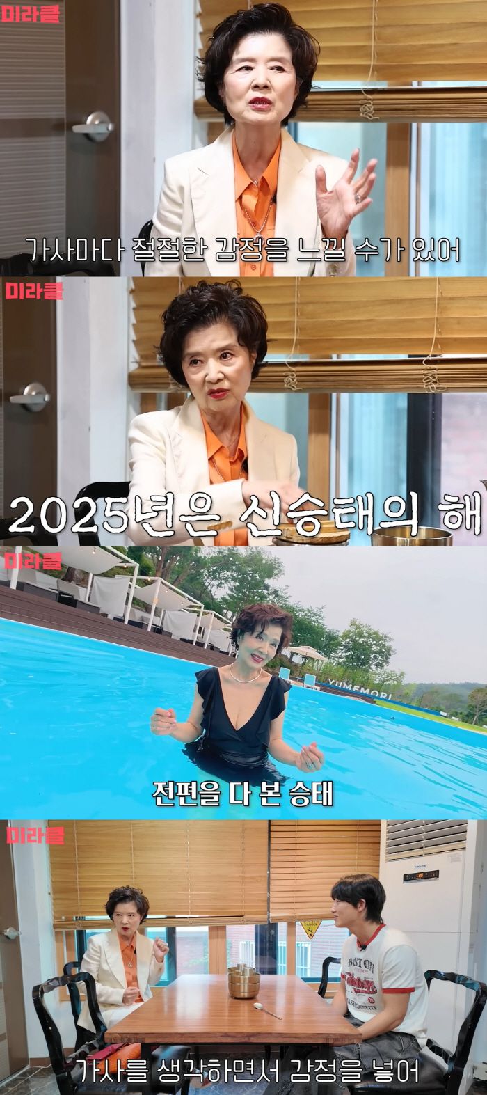 이에 신승태는 "가사를 생각하며 부른다"고 답했고 윤미라는 "앞으로 배우를 해라. 배우를 해야 할 것 같다. 지도편달 안해도 충분히 잘할 거 같다. 지금 신승태는 중년 엄마들에게 최고의 인기다"라 칭찬했다.