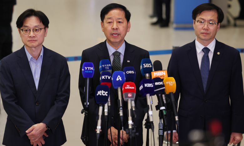 미국과의 무역협상을 마친 구윤철 경제부총리가 1일 인천국제공항 제2여객터미널을 통해 귀국해 취재진 질문에 답하고 있다. 왼쪽부터 김정관 산업통상자원부 장관, 구 부총리, 여한구 통상교섭본부장. 연합뉴스