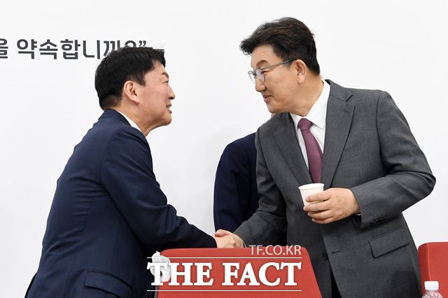국민의힘 권성동(오른쪽) 의원이 지난달 30일 안철수 의원을 겨냥해 "'여의도 대표 하(下)남자'라는 별명이 괜히 붙은 게 아니다"고 비꼬았다. 특검의 12·3 비상계엄 사태 관련 참고인 출석 요청을 거부한 것을 힐난한 것이다. 그러자 안 의원은 페이스북에 권 의원이 과거 윤석열 전 대통령과 메시지를 주고받는 이른바 '체리 따봉' 사진을 올리며 "하수인"이라고 맞받았다. /남용희 기자