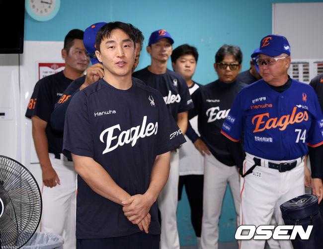 [OSEN=광주, 이대선 기자] 1일 오후 광주-기아 챔피언스필드에서 2025 신한 SOL Bank KBO리그 KIA 타이거즈와 한화 이글스의 경기가 열렸다.KIA는 이의리, 한화는 류현진을 선발 투수로 내세웠다.경기에 앞서 한화 손아섭이 선수단과 인사를 나누고 있다. 2025.08.01 /sunday@osen.co.kr