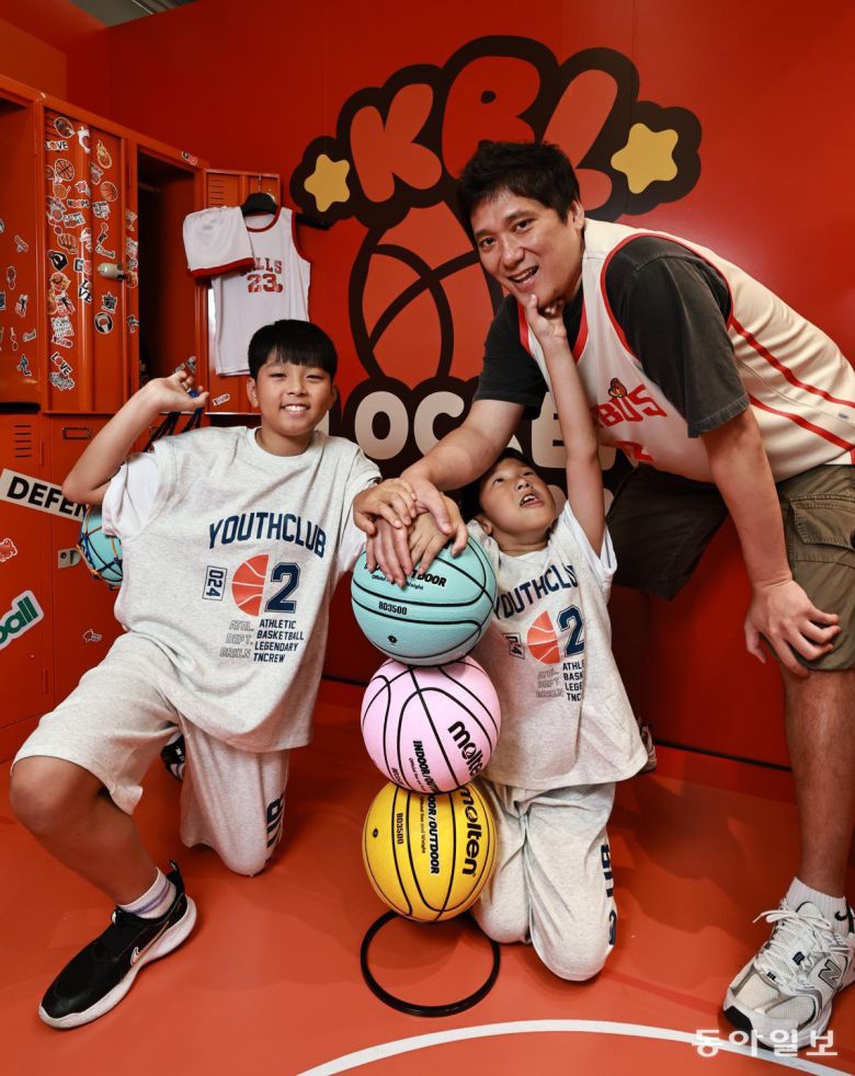 프로농구 현대모비스의 함지훈(오른쪽)이 지난달 30일 한국농구연맹(KBL)이 마련한 팝업스토어 포토존에서 아들 승후(왼쪽), 윤우와 함께 사진을 찍고 있다. 프로농구 현역 최고령 선수인 함지훈은 이날 팝업스토어에서 ‘일일 아르바이트’를 했다. 양회성 기자 yohan@donga.com