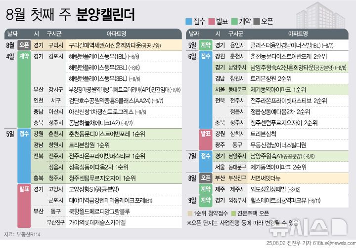 [서울=뉴시스]정진형 기자 = 부동산R114는 8월 첫째 주 전국 8개 단지 총 5383가구가 분양을 시작한다고 2일 밝혔다. 이중 일반분양은 3683가구 규모다.