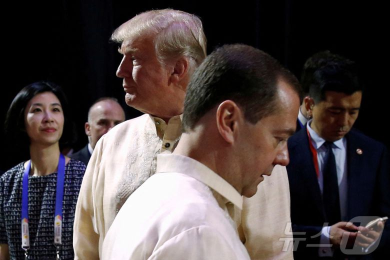 2017년 11월 12일 필리핀 마닐라에서 열린 동남아시아국가연합(아세안) 정상회의 갈라 만찬에서 도널드 트럼프 미국 대통령과 드미트리 메드베데프 당시 러시아 총리(왼쪽)가 서로를 외면한 채 스쳐 지나고 있다. 2025.08.01 ⓒ 로이터=뉴스1 ⓒ News1 류정민 특파원 |