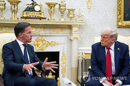대화 나누는 트럼프 대통령과 나토 사무총장 (로이터=연합뉴스) 도널드 트럼프 미국 대통령과 마르크 뤼터 나토 사무총장이 지난달 14일 미국 백악관에서 회동하는 모습. [연합뉴스 자료사진. 재판매 및 DB 금지]