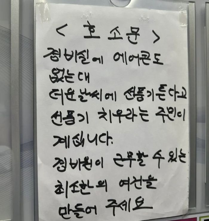 그가 올린 호소문에는 ‘경비실에 에어컨도 없는데, 더운 날씨에 선풍기 튼다고 선풍기 치우라는 주민이 있다. 경비원이 근무할 수 있는 최소한의 여건을 만들어달라’는 내용이 담겼다. 호소문은 경비원이 작성한 것으로 보인다.